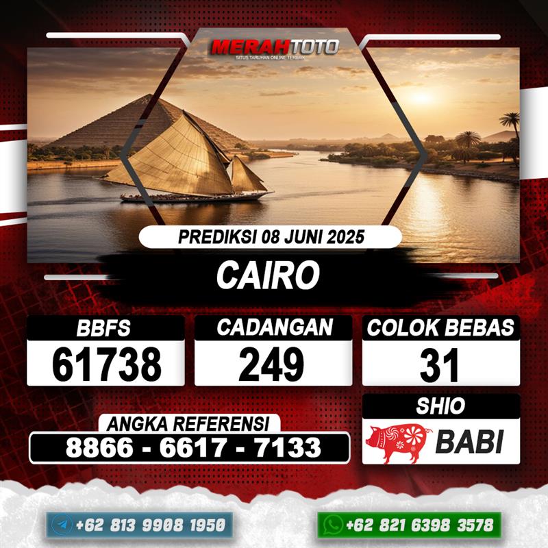 Prediksi CAIRO 08 Juni 2025 – Selamat Datang di Situs Prediksi Togel Online Akurat dan Resmi MERAHTOTO. Permainan Togel atau Toto – Gelap ini telah lama menarik perhatian dan banyak dimainkan oleh para bettor. Sejak dulu permainan togel dimainkan dengan memasang taruhan angka dengan bandar darat yang tersedia di daerah masing – masing. Namun sekarang ini dengan perkembangan teknologi yang semakin maju, para bettor bisa menikmati permainan togel secara online. Anda bisa menemukan banyaknya Situs Bandar Togel Online yang menyediakan layanan pemasangan angka togel secara praktis. Dimana masing – masing situs bandar togel online resmi dan terpercaya tentu menyediakan layanan dan keuntungan yang berbeda – beda untuk Anda.
