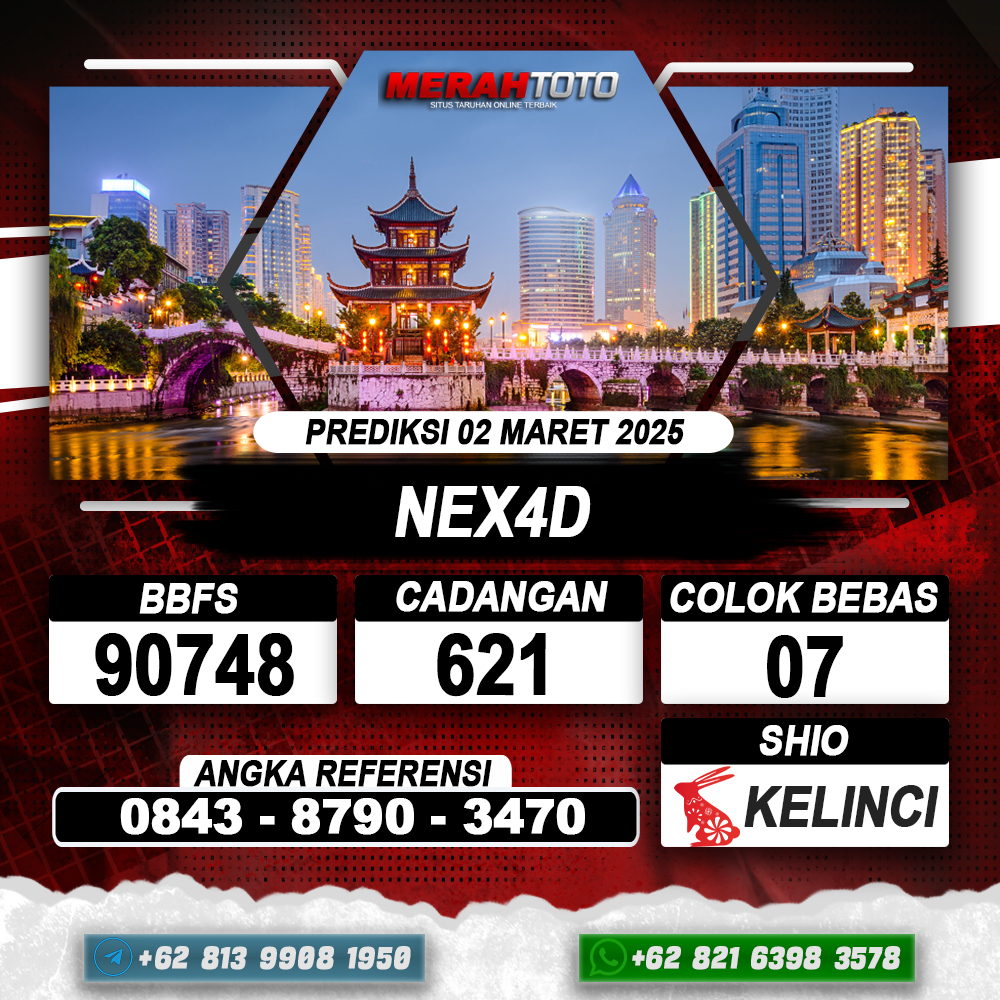 Prediksi NEX4D 02 MARET 2025 – Selamat Datang di Situs Prediksi Togel Online Akurat dan Resmi MERAHTOTO. Permainan Togel atau Toto  – Gelap ini telah lama menarik perhatian dan banyak dimainkan oleh para bettor. Sejak dulu permainan togel dimainkan dengan memasang taruhan angka dengan bandar darat yang tersedia di daerah masing – masing. Namun sekarang ini dengan perkembangan teknologi yang semakin maju, para bettor bisa menikmati permainan togel secara online. Anda bisa menemukan banyaknya Situs Bandar Togel Online yang menyediakan layanan pemasangan angka togel secara praktis. Dimana masing – masing situs bandar togel online resmi dan terpercaya tentu menyediakan layanan dan keuntungan yang berbeda – beda untuk Anda.