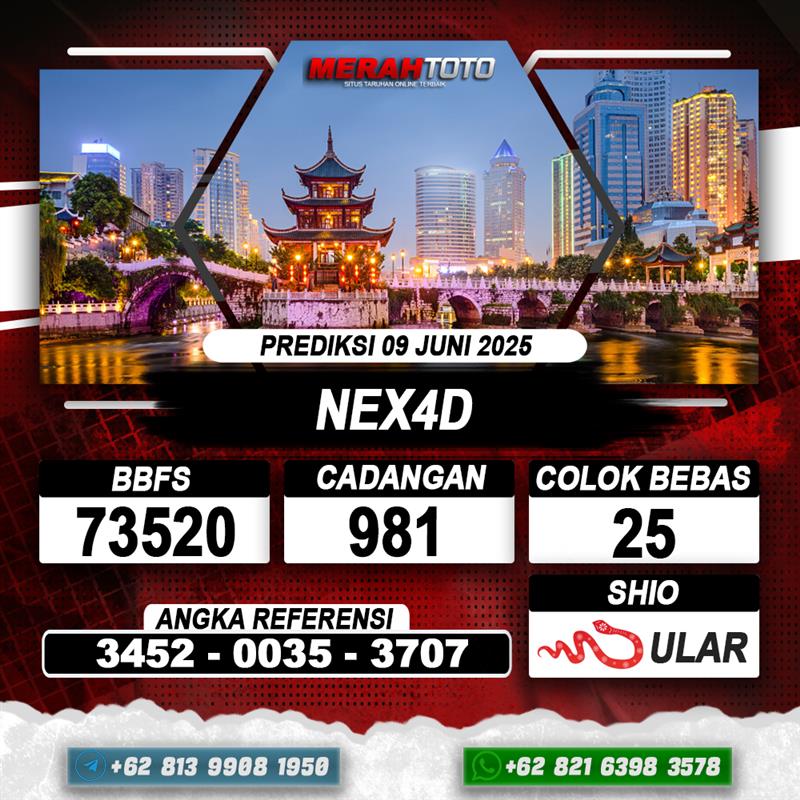 Prediksi NEX4D 09 Juni 2025 – Selamat Datang di Situs Prediksi Togel Online Akurat dan Resmi MERAHTOTO. Permainan Togel atau Toto – Gelap ini telah lama menarik perhatian dan banyak dimainkan oleh para bettor. Sejak dulu permainan togel dimainkan dengan memasang taruhan angka dengan bandar darat yang tersedia di daerah masing – masing. Namun sekarang ini dengan perkembangan teknologi yang semakin maju, para bettor bisa menikmati permainan togel secara online. Anda bisa menemukan banyaknya Situs Bandar Togel Online yang menyediakan layanan pemasangan angka togel secara praktis. Dimana masing – masing situs bandar togel online resmi dan terpercaya tentu menyediakan layanan dan keuntungan yang berbeda – beda untuk Anda.