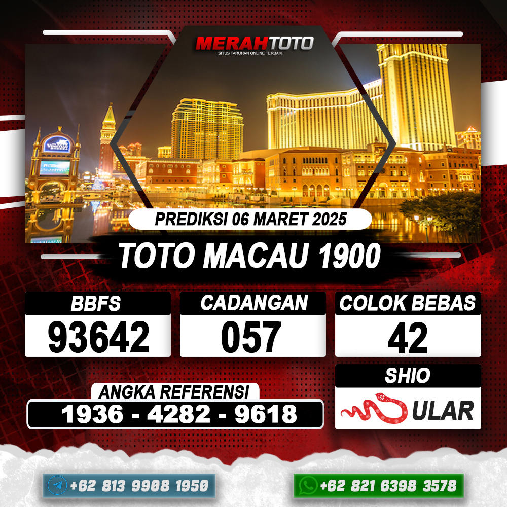 Prediksi TOTO MACAU 1900 06 MARET 2025 – Selamat Datang di Situs Prediksi Togel Online Akurat dan Resmi MERAHTOTO. Permainan Togel atau Toto – Gelap ini telah lama menarik perhatian dan banyak dimainkan oleh para bettor. Sejak dulu permainan togel dimainkan dengan memasang taruhan angka dengan bandar darat yang tersedia di daerah masing – masing. Namun sekarang ini dengan perkembangan teknologi yang semakin maju, para bettor bisa menikmati permainan togel secara online. Anda bisa menemukan banyaknya Situs Bandar Togel Online yang menyediakan layanan pemasangan angka togel secara praktis. Dimana masing – masing situs bandar togel online resmi dan terpercaya tentu menyediakan layanan dan keuntungan yang berbeda – beda untuk Anda.
